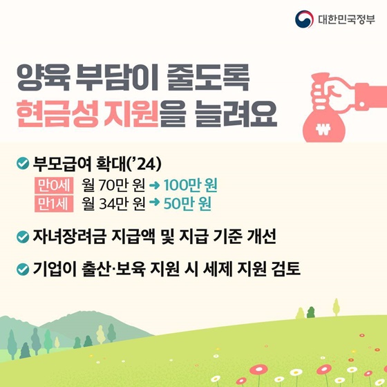 양육 부담이 줄도도록 현금성 지원을 늘립니다.